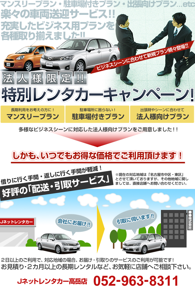 Jネットレンタカーは、「チャレンジ精神」と、お客様を思いやる「サービス精神」を ブラッシュアップして、理想のレンタカーを追求していきます。 会社詳細はこちらから