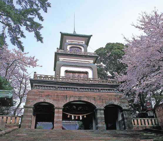 加賀藩祖・前田利家公と正室お松の方を祀る由緒ある神社です。国指定重要文化財に指定されている神門は、和漢洋の3つの建築様式が用いられた異色の門として、兼六園とともに金沢市のシンボルになっています。特に最上階にはめ込まれた色鮮やかなギヤマン張りは、とても美しく魅力的です。